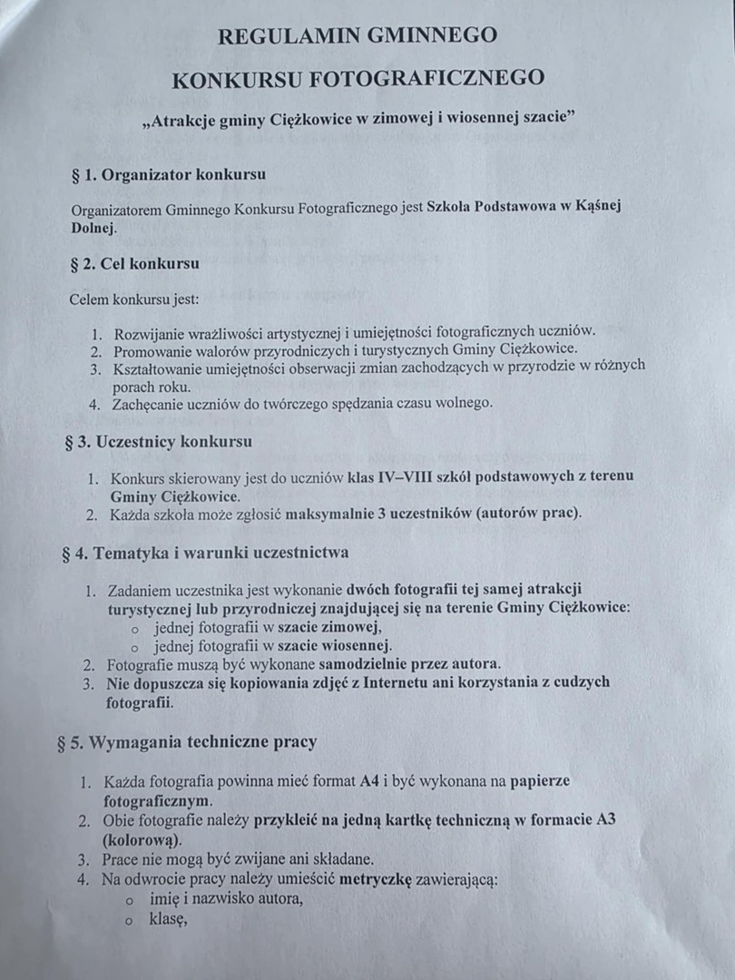 Szkoła Podstawowa w Kąśnej Dolnej zaprasza uczniów klas IV–VIII do udziału w konkursie fotograficznym pt. „Atrakcje gminy Ciężkowice w zimowej i wiosennej szacie”.