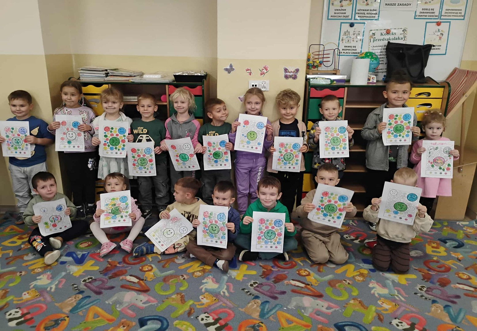 27 października nasze przedszkolaki rozpoczęły realizację zadań z Ogólnopolskiego Projektu Edukacyjnego „Sekrety dobrego zachowania”. Pierwszym realizowanym tematem było zagadnienie dotyczące nadmiernego hałasowania na podstawie bajki pt.: „Głośne kaczątko”. Dzieci z uwagą słuchały opowiadania i trafnie rozpoznawały podstawowe emocje. Następnie dokonywały samooceny własnego nastroju. Nie zabrakło również ćwiczeń wyciszających, po których nasze przedszkolaki prezentowały sposoby bezpiecznego radzenia sobie z trudnymi emocjami.