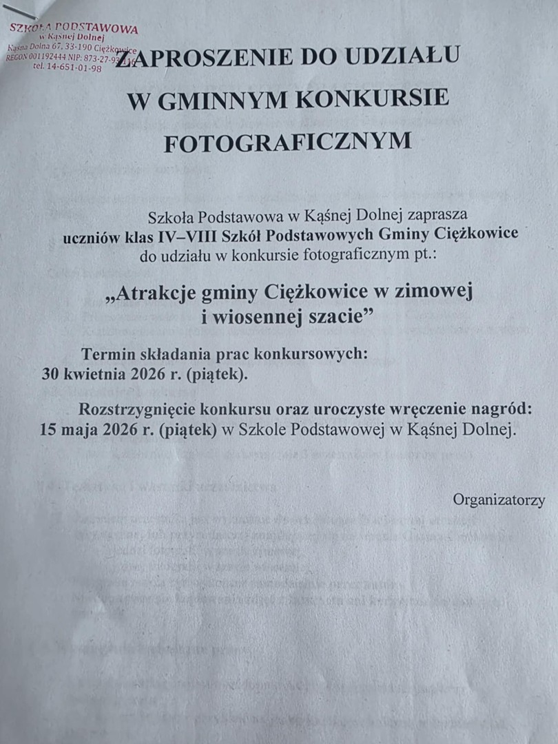 Szkoła Podstawowa w Kąśnej Dolnej zaprasza uczniów klas IV–VIII do udziału w konkursie fotograficznym pt. „Atrakcje gminy Ciężkowice w zimowej i wiosennej szacie”.